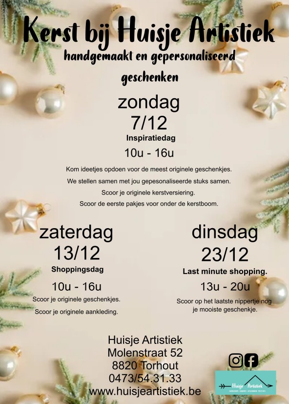 Deze dagen zal er mogelijkheid zijn om handgemaakte geschenkjes en kerstversiering te kopen. Liever iets gepersonaliseerd, dan neem ik 7/12 extra tijd om met jou te puzzelen tot een originele creatie, die je dan ook kan bestellen. 13/12 kan je ook nog gepersonaliseerde geschenkjes vragen, maar de gaatjes in de agenda om dit te maken worden schaarser. Dus wees tijdig!